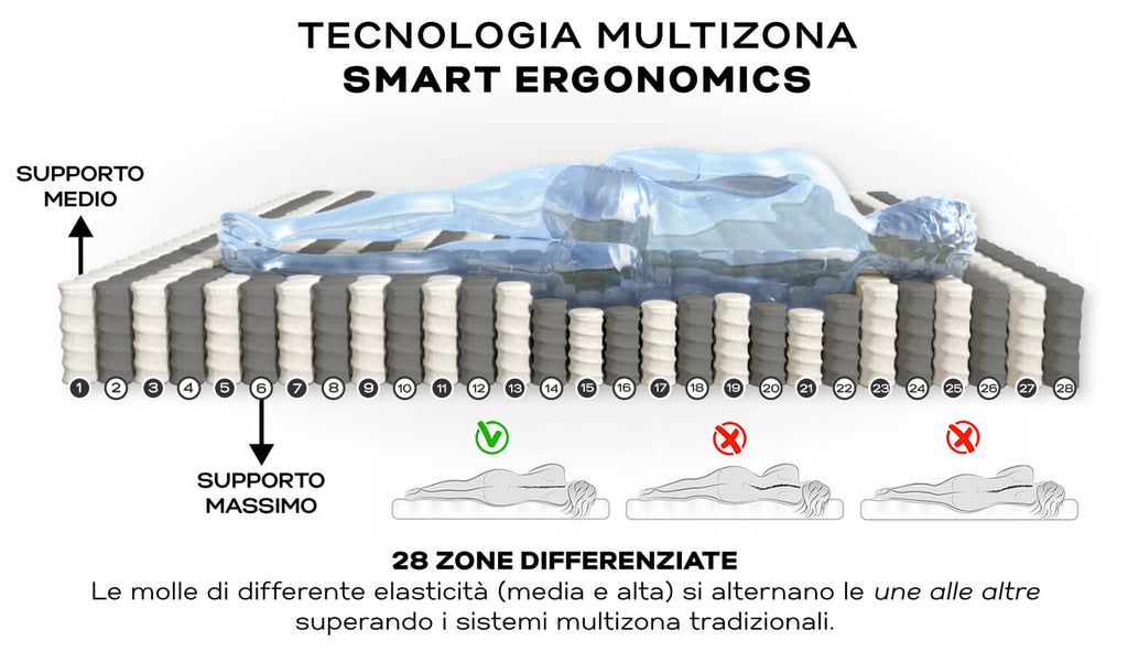Matelas à ressorts ensachés multi-zones avec technologie innovante Smart Ergonomics.