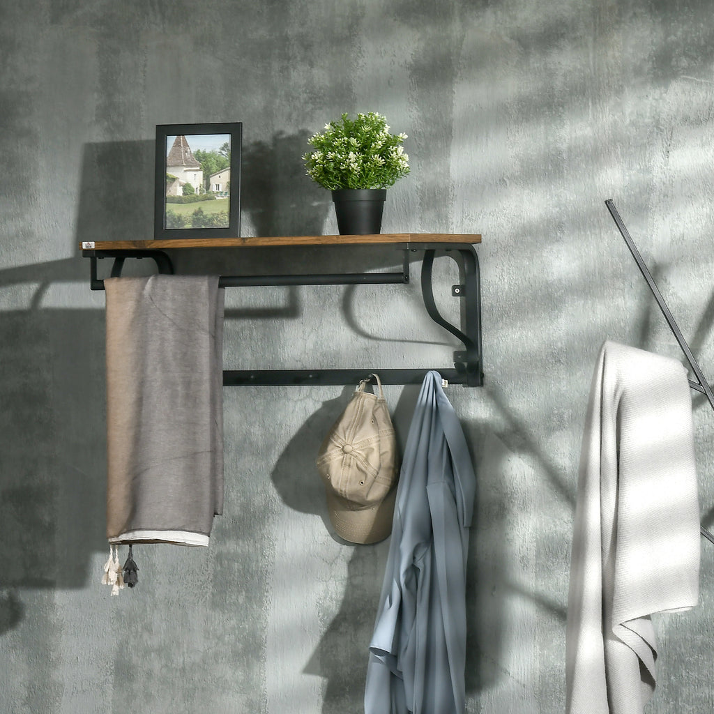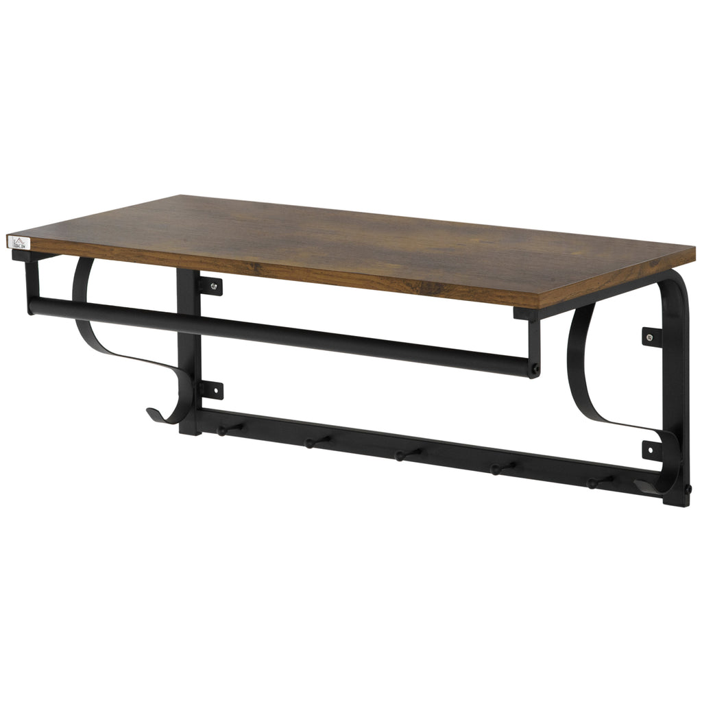 Etagère Murale 66x30x27 cm avec 7 Crochets et Barre en Acier et Aggloméré Marron