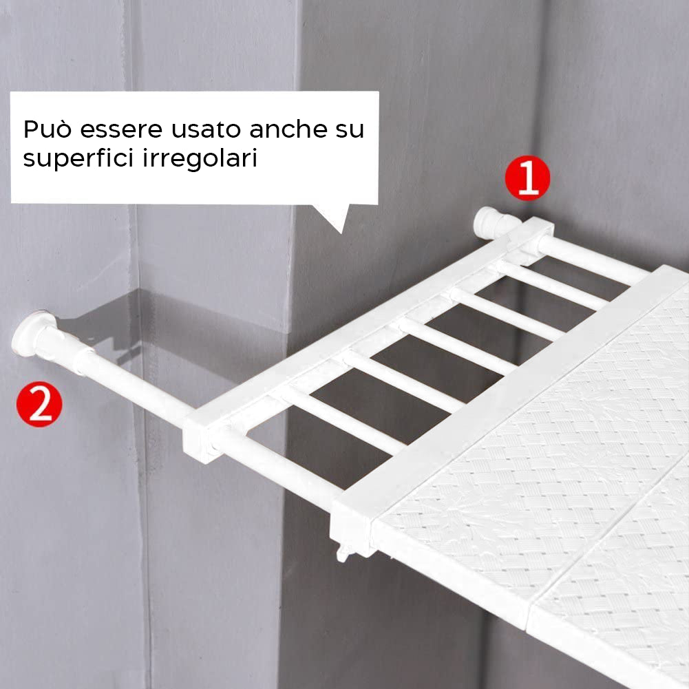Pour sa fixation, vous n'avez pas besoin de vis, de trous et d'adhésifs, il vous suffit d'adapter les tiges télescopiques aux extrémités du meuble où vous souhaitez les placer et il pourra supporter de manière stable ce que vous placez dessus .