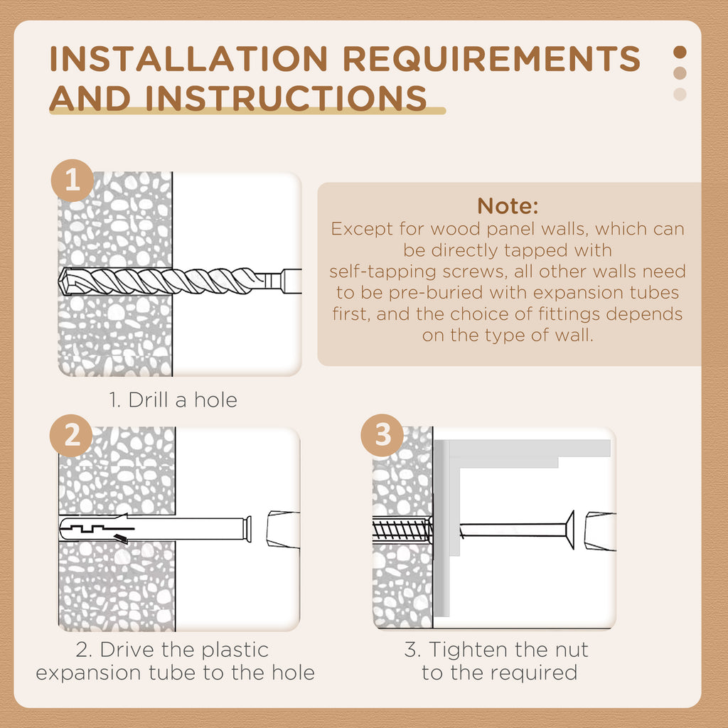 - Nota: ad eccezione delle pareti in legno, che possono essere direttamente avvitate con viti autofilettanti, tutte le altre pareti devono essere preventivamente interrate con tubi di espansione e la scelta dei raccordi dipende dal tipo di parete.