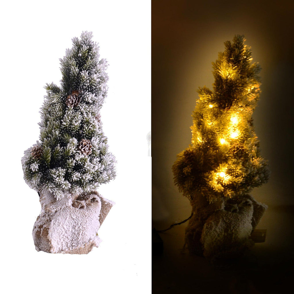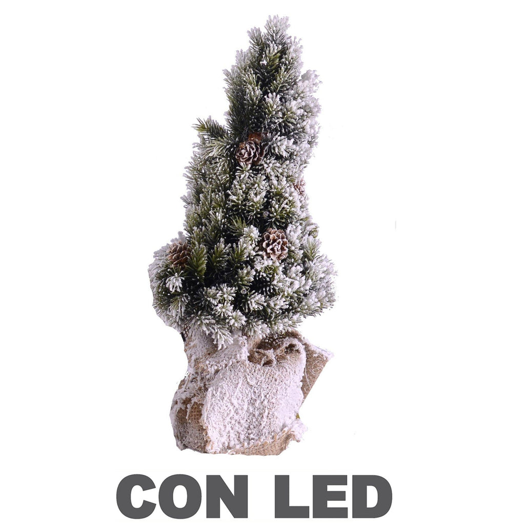 - Arbre Mottarone vert enneigé avec led, pommes de pin et base en jute cm h45