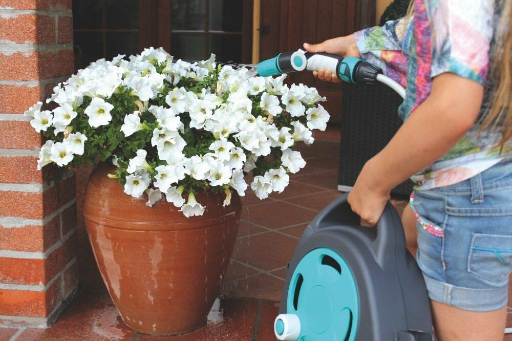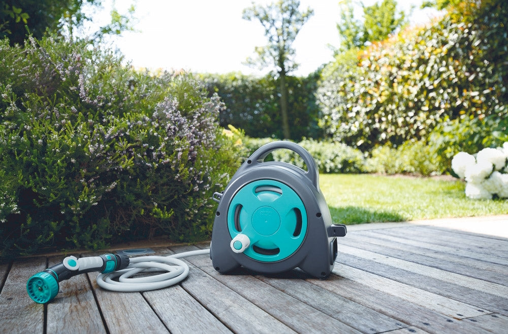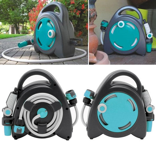 Mini enrouleur "AQUA BAG". Le nouveau dévidoir version mini est idéal pour arroser les plantes, les fleurs et les pots placés sur les terrasses, les balcons, les vérandas et les petits jardins. Grâce au double mode d'utilisation, qui peut être posé au sol ou transporté, il est extrêmement pratique lors de son utilisation car il est compact, léger et possède un nouveau design captivant, rendant les moments en plein air encore plus agréables.