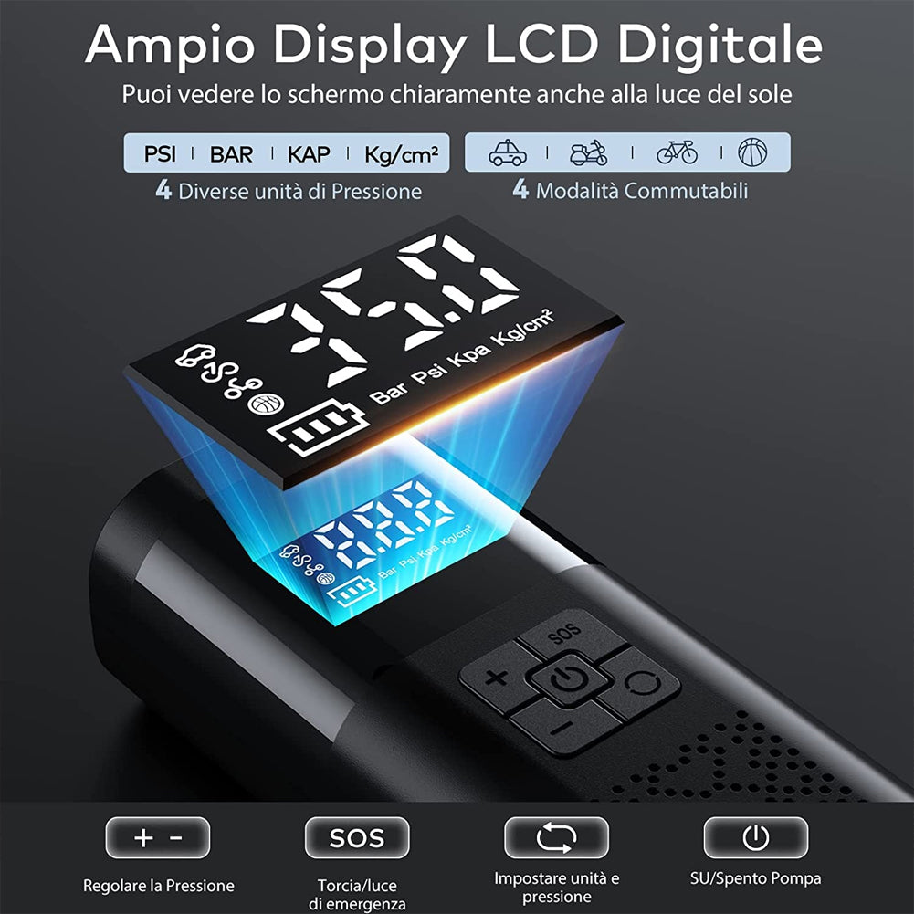 Questo compressore auto ha quattro unità di pressione: PSI, KPA,BAR e KG/CM2 e funziona da 0-150 PSI. Grazie all'ampio display LCD, tutte queste unità possono essere viste chiaramente anche alla luce del sole.