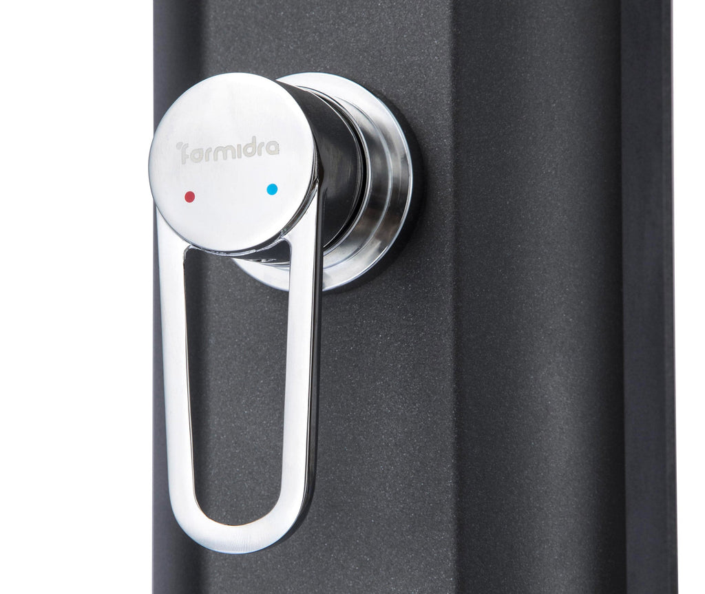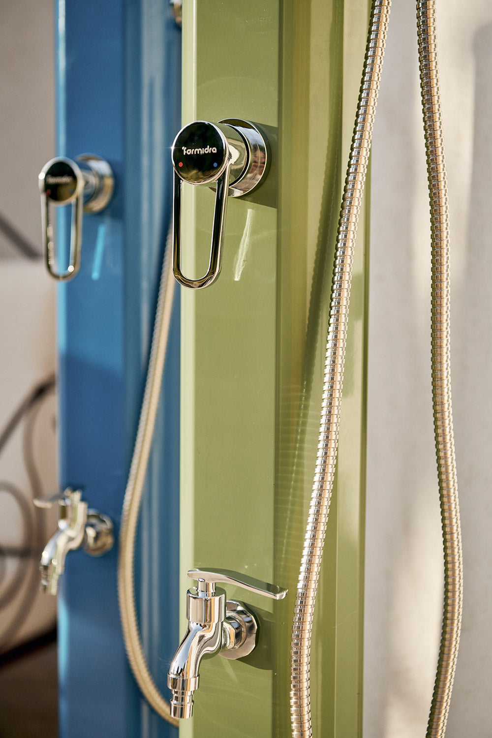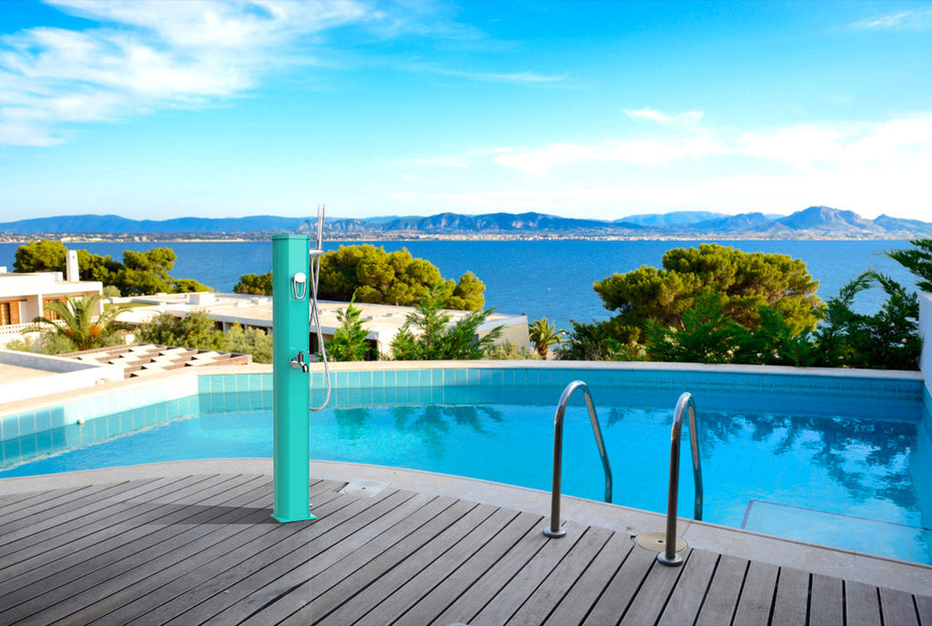 Mini Doccia a Riscaldamento Solare da Giardino e Piscina 20 litri con Miscelatore Caldo-Freddo Lavapiedi e Doccetta. Questa doccia solare unisce design elegante e ingombro ridotto. Consegnata con la sua doccetta rimovibile, il suo utilizzo è semplice e giocoso.