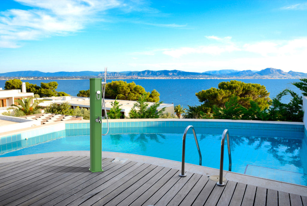 Mini Doccia a Riscaldamento Solare da Giardino e Piscina 20 litri con Miscelatore Caldo-Freddo Lavapiedi e Doccetta. Questa doccia solare unisce design elegante e ingombro ridotto. Consegnata con la sua doccetta rimovibile, il suo utilizzo è semplice e giocoso.