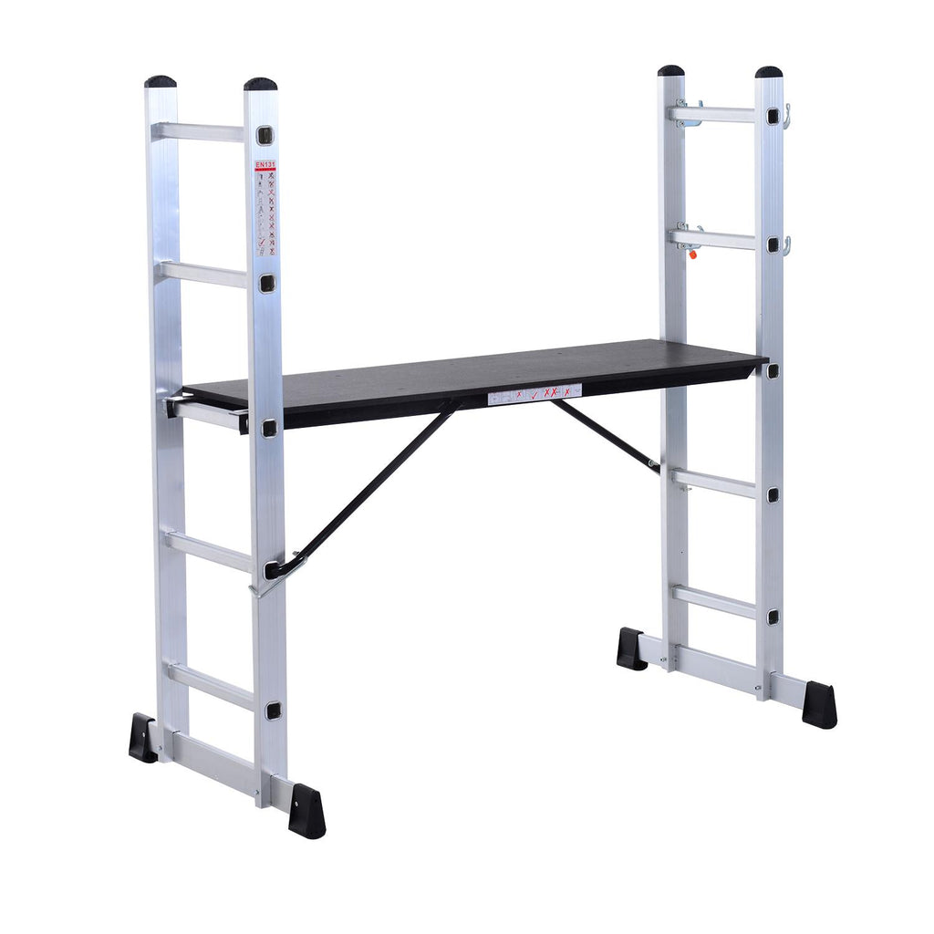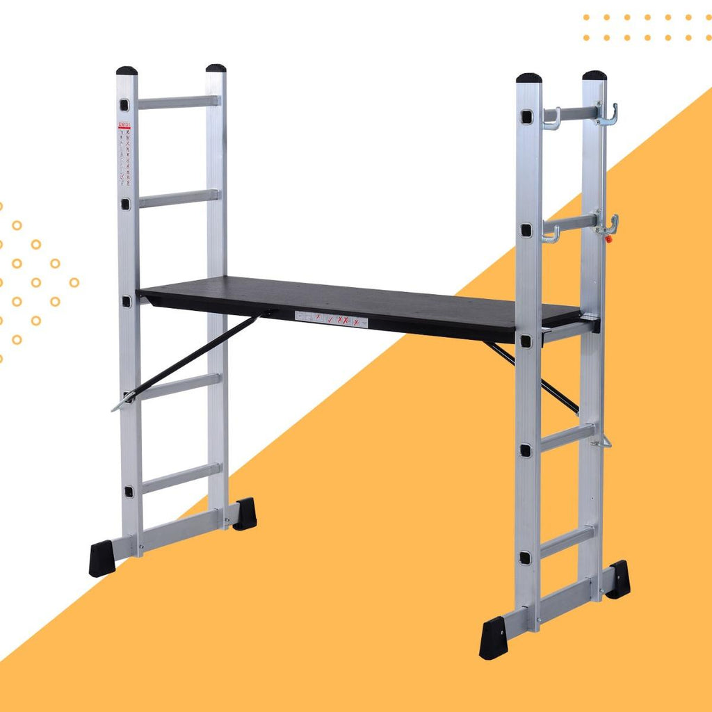 Cet échafaudage en aluminium multifonctionnel est un excellent accessoire pour faciliter le travail en hauteur. Construit avec deux supports d'échelle et une plate-forme debout en bois, il peut vous aider à peindre et à décorer en hauteur. L'échafaudage est construit avec un cadre robuste et peut supporter jusqu'à 150 kg.