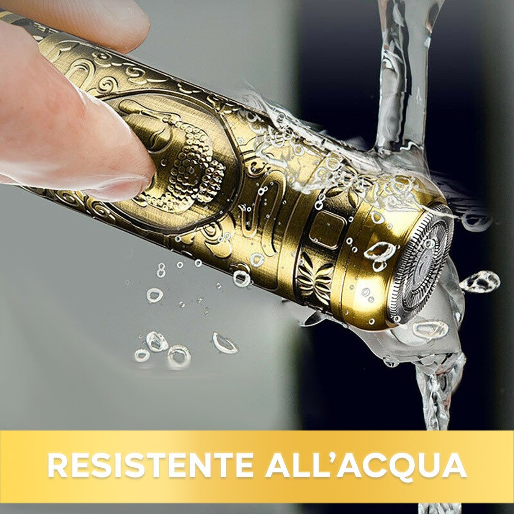 Fabriqué en alliage de titane, avec sa longueur de seulement 8,5 cm, il est même possible de le transporter dans une poche. Équipé de 2 lames rotatives, il vous permettra d'éliminer très facilement les poils en excès : la forme ronde des lames permet une épilation sans risque de se couper, tout en pouvant atteindre même les zones les plus difficiles comme les coins du nez ou du menton. De plus, le mini rasoir peut être utilisé sur les visages secs et humides sans aucun danger. À l'intérieur de l'emballage, vous trouverez également une petite brosse pour pouvoir la nettoyer après le rasage.