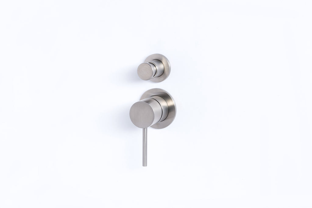 Miscelatore monocomando per doccia a 2 vie diametro 34mm con deviatore a pulsante con ritorno automatico e connessione G1/2". Nati per essere contemporanei, le superfici lisce e pulite fanno dei rubinetti Tevere un accessorio di design per spazi moderni