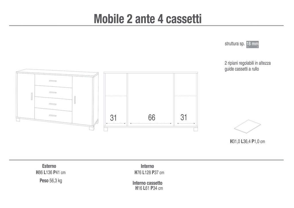 Armoire 2 Portes 4 Tiroirs 136x86x41 cm Orme Clair