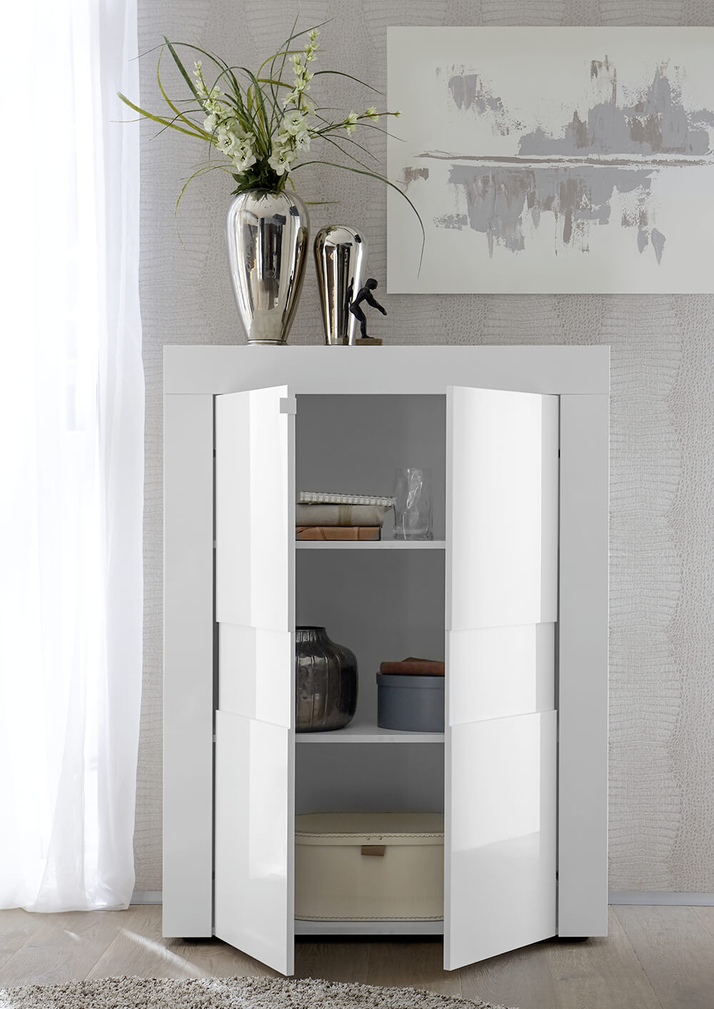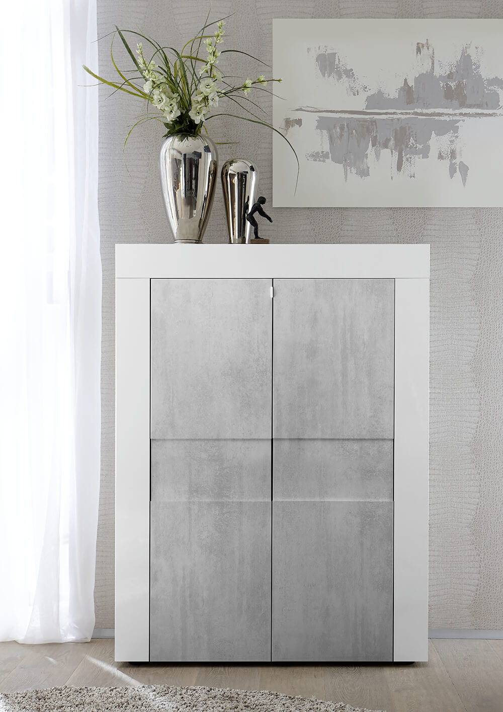 Meuble de Salon Haut 2 Portes 92x42x125cm TFT Build Blanc Brillant et Ciment