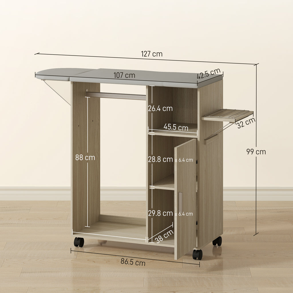 Questo mobile da stiro offre tutto lo spazio necessario per sistemare i tuoi vestiti. Piccolo ma completo, la struttura è composta da un ripiano portaoggetti, un armadietto a 2 livelli e uno spazio aperto per i vestiti appesi. Inoltre, il mobile possiede un piano stirabile e ripiegabile, assieme a 4 ruote girevoli per spostarlo con facilità dove si desidera.