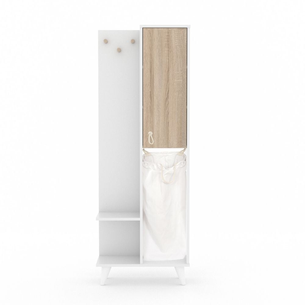 Meuble de salle de bain au design unique. Sur le côté droit on retrouve une colonne composée d'étagères confortables fermées par une porte, tandis qu'en partie basse un grand panier à linge. Sur le côté gauche, cependant, un compartiment ouvert et trois porte-serviettes utiles de couleur contrastée. La poignée en corde pour ouvrir la porte est très belle.