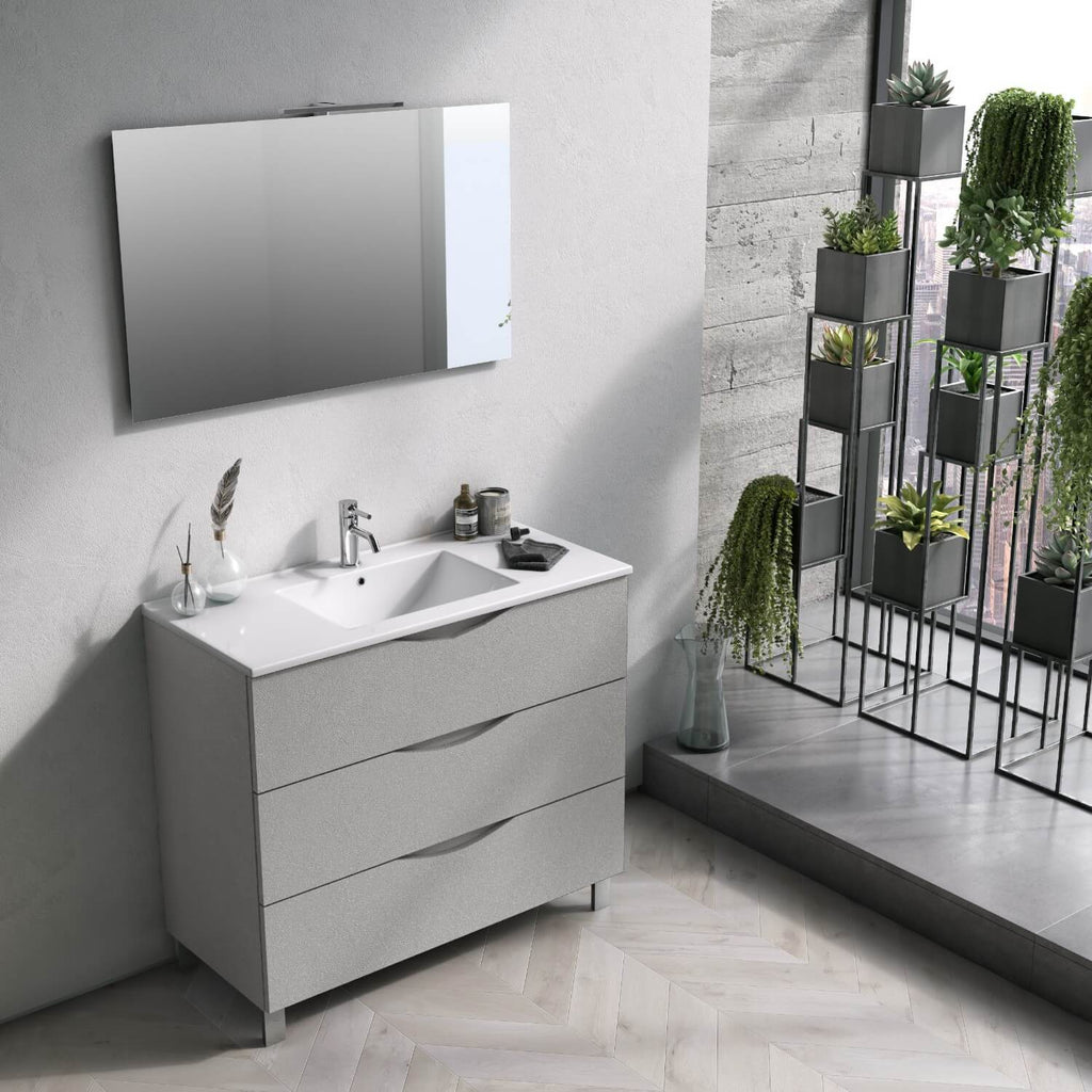 Meuble de Salle de Bain Suspendu 100 cm, Lavabo Miroir et Lampe LED Marte TFT Gris Clair