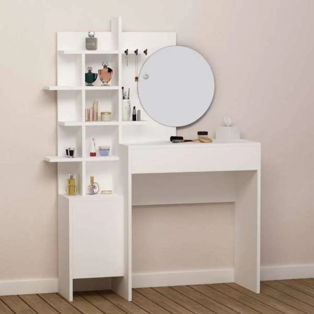 - Toilettes de maquillage blanches avec miroir rond, tiroir, porte avec étagère et compartiments ouverts