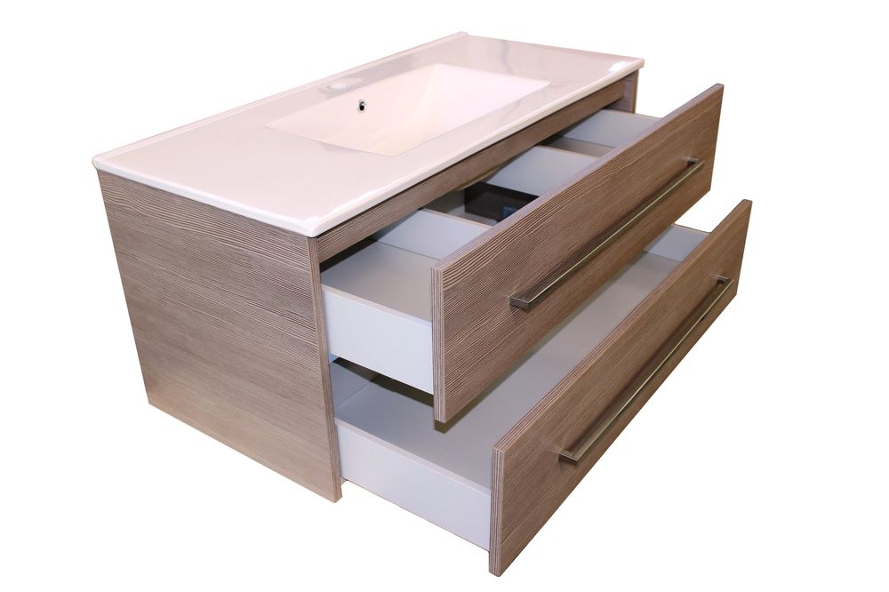 Meuble de salle de bain composé de quatre pièces, tiroirs à fermeture amortie, lavabo en céramique, miroir avec éclairage LED arrière, élément mural réversible droite/gauche à fermeture amortie, une étagère fixe en bois et deux étagères réglables en verre et poignées en métal