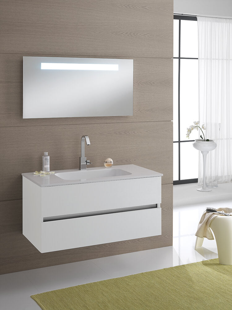 Meuble de salle de bain moderne Bali 10C complet meuble suspendu à deux tiroirs avec vasque stonelight et miroir rétro-éclairé.