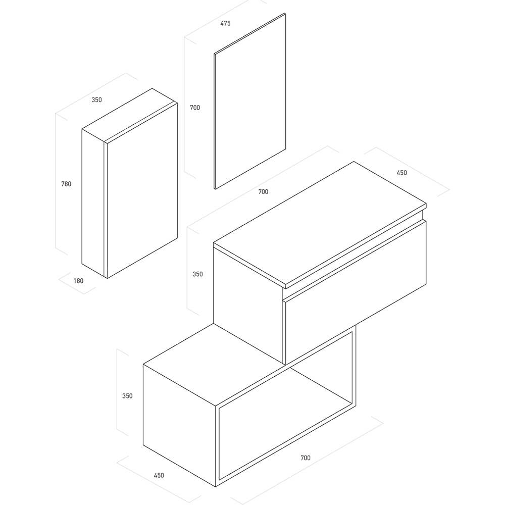 - Meuble bas avec tiroir à fermeture amortie et poignée rainure en aluminium 70x45x35 cm