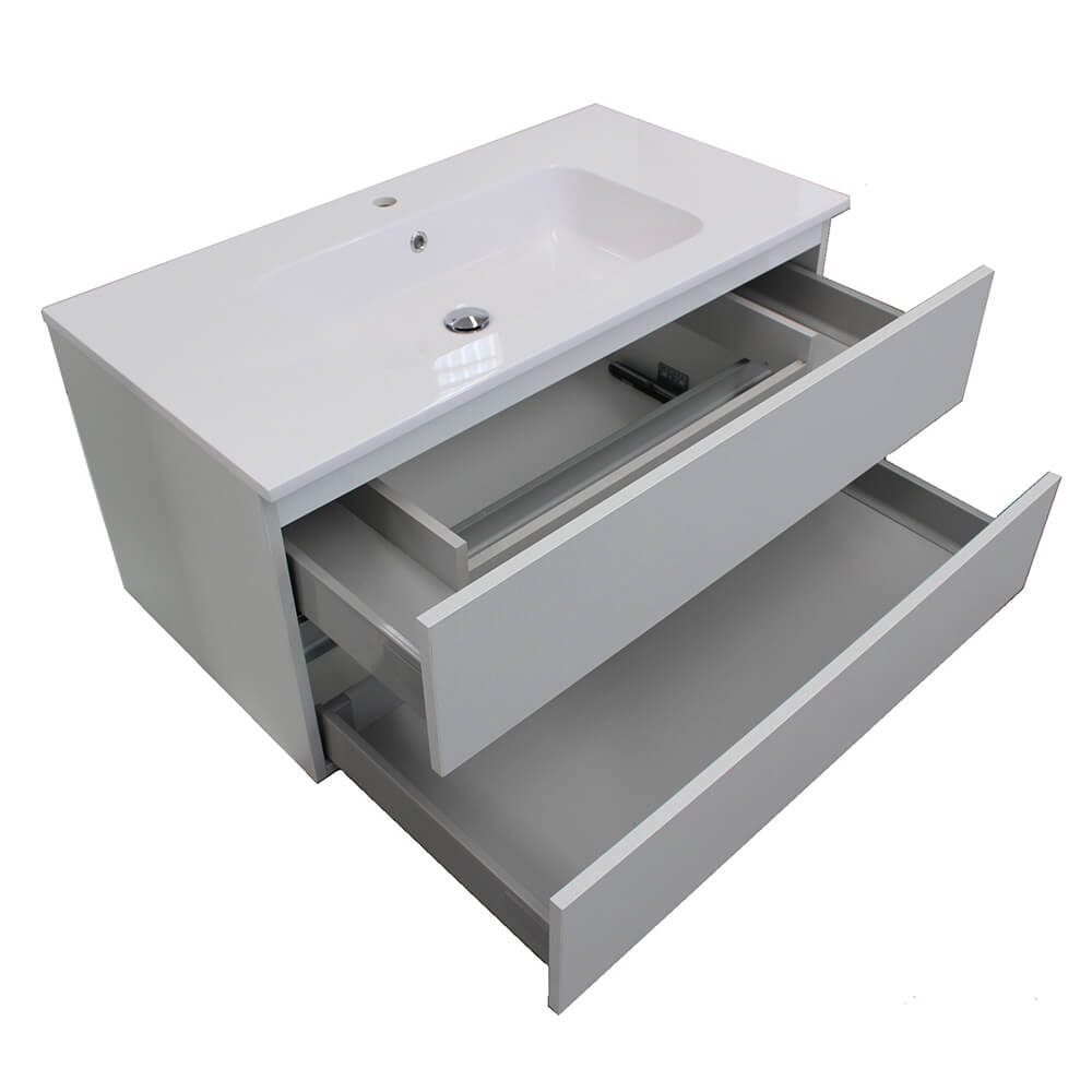 Meuble de salle de bain moderne Samoa 10 avec meuble bas suspendu à double tiroir, plan de toilette avec lavabo intégré et miroir avec lampe LED.