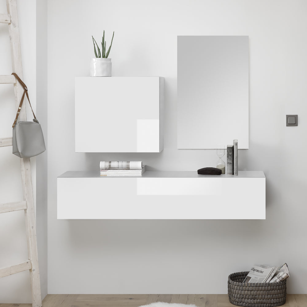 Le meuble d'entrée Yuma blanc brillant est une composition entièrement suspendue caractérisée par des lignes géométriques et conçue pour satisfaire le désir d'un mobilier moderne et pratique. Il est composé d'un abattant sans poignée, d'un cube avec une porte équipée de guides et charnières métalliques, et d'un miroir de 2 cm d'épaisseur.