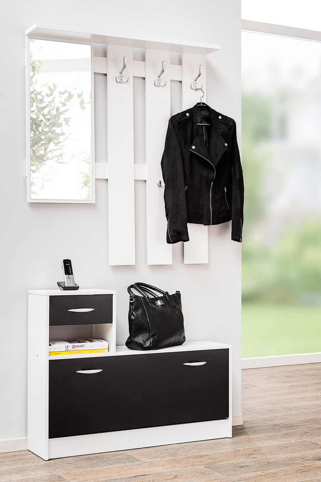 Portemanteau d'entrée avec miroir et étagère à chaussures en aggloméré Alfred noir et blanc
