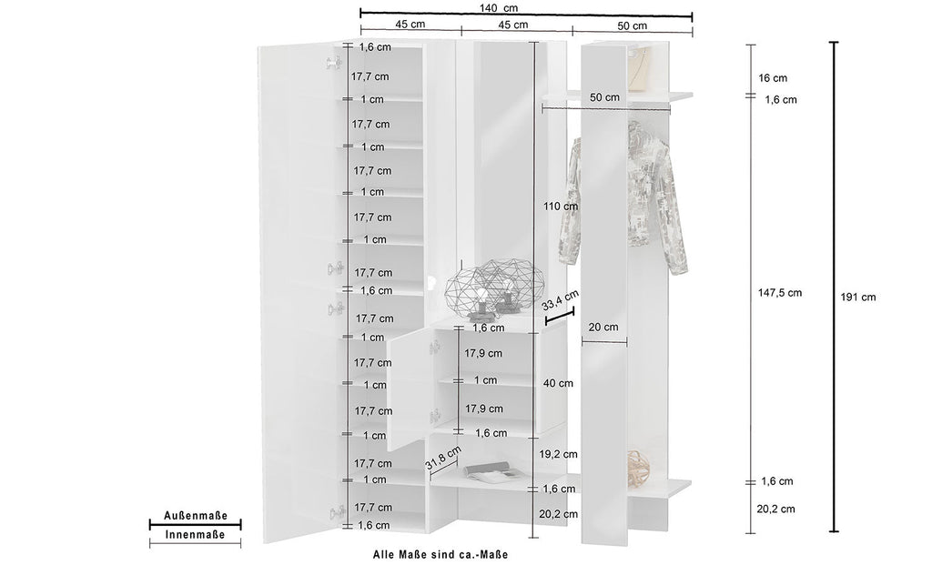 Il Set ingresso KOMPACT da 3 pezzi offre una soluzione versatile per completare l'ingresso di casa o arricchire una parete con stile e funzionalità. Con dimensioni di 140 x 35 x 191 cm e un peso di 83 kg, questo set presenta una struttura e frontali spessi 16 mm, garantendo che il complemento d'arredo duri nel tempo. Realizzato in Italia con materiale in legno riciclato, il design moderno e originale si integra perfettamente in ogni ambiente domestico. Oltre a fornire ampio spazio per riporre quello che si vuole grazie ai suoi 12 ripiani interni e un'asta appendiabiti, il set include anche 2 comodi specchi, offrendo così una soluzione completa per organizzare indumenti, oggetti e scarpe in modo ordinato e facile da raggiungere. Versatile e capiente, il Set ingresso KOMPACT da 3 pezzi è la scelta ideale per completare con eleganza e praticità l'entrata di casa o di qualsiasi altro ambiente, risparmiando tempo nella ricerca della giusta combinazione di mobili. Semplice da montare, viene fornito in un intuitivo kit con chiare istruzioni di montaggio. Il Set ingresso KOMPACT da 3 pezzi, completamente realizzato in Italia che pone la sua attenzione alla funzionalità senza rinunciare al design, offre una soluzione completa per chiunque voglia arricchire l'ingresso della propria casa con stile e praticità. Questo set, disponibile nel raffinato colore bianco laccato, include un grande armadio scarpiera, un mobile contenitore con un'anta, una specchiera e un appendiabiti, fornendo così tutti gli elementi necessari per rendere l'ingresso elegante e funzionale.Le dimensioni compatte unite alla versatilità del design, consentono a questo set di adattarsi facilmente a qualsiasi ambiente, dal corridoio alla zona giorno.