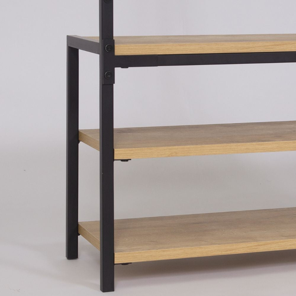 Lo scaffale ingresso Nomad è caratterizzato da una struttura di colore nero e ripiani in rovere. Dotato di 5 ganci appendiabiti multipli e 3 ripiani realizzati in truciolare di alta qualità, può sostenere fino a 42 kg di peso. La struttura è realizzata in metallo, mentre i ripiani sono rivestiti con un melaminico di spessore 18 mm. Le dimensioni dell'articolo sono di L 78 x P 30 x H 182 cm.