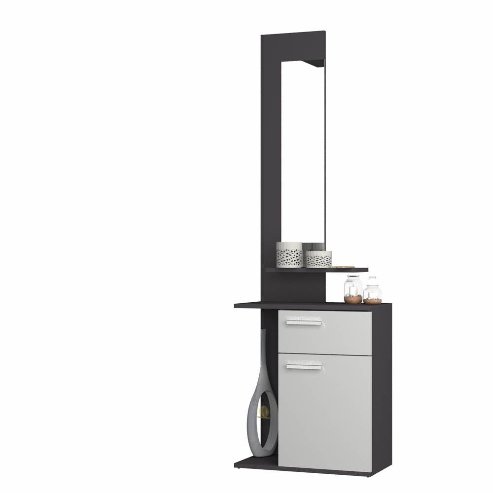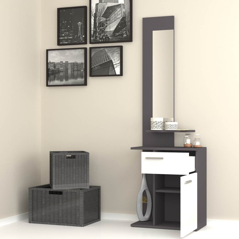 Mobilier d'entrée pratique et pratique. Un tiroir, un miroir, un compartiment avec porte et une étagère pratique faciliteront vos entrées ou sorties de la maison. Vous pourrez ranger facilement vos clés, votre télécommande et votre téléphone sans vous soucier de les chercher dans les chambres. La couleur blanche en fonte s'associe facilement à vos environnements.