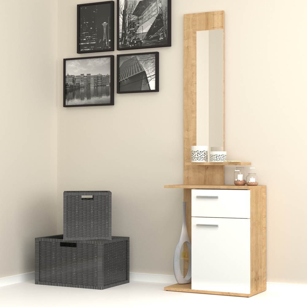 Mobilier d'entrée pratique et pratique. Un tiroir, un miroir, un compartiment avec porte et une étagère pratique faciliteront vos entrées ou sorties de la maison. Vous pourrez ranger facilement vos clés, votre télécommande et votre téléphone sans vous soucier de les chercher dans les chambres. La couleur chêne blanc s'associe facilement à vos environnements.