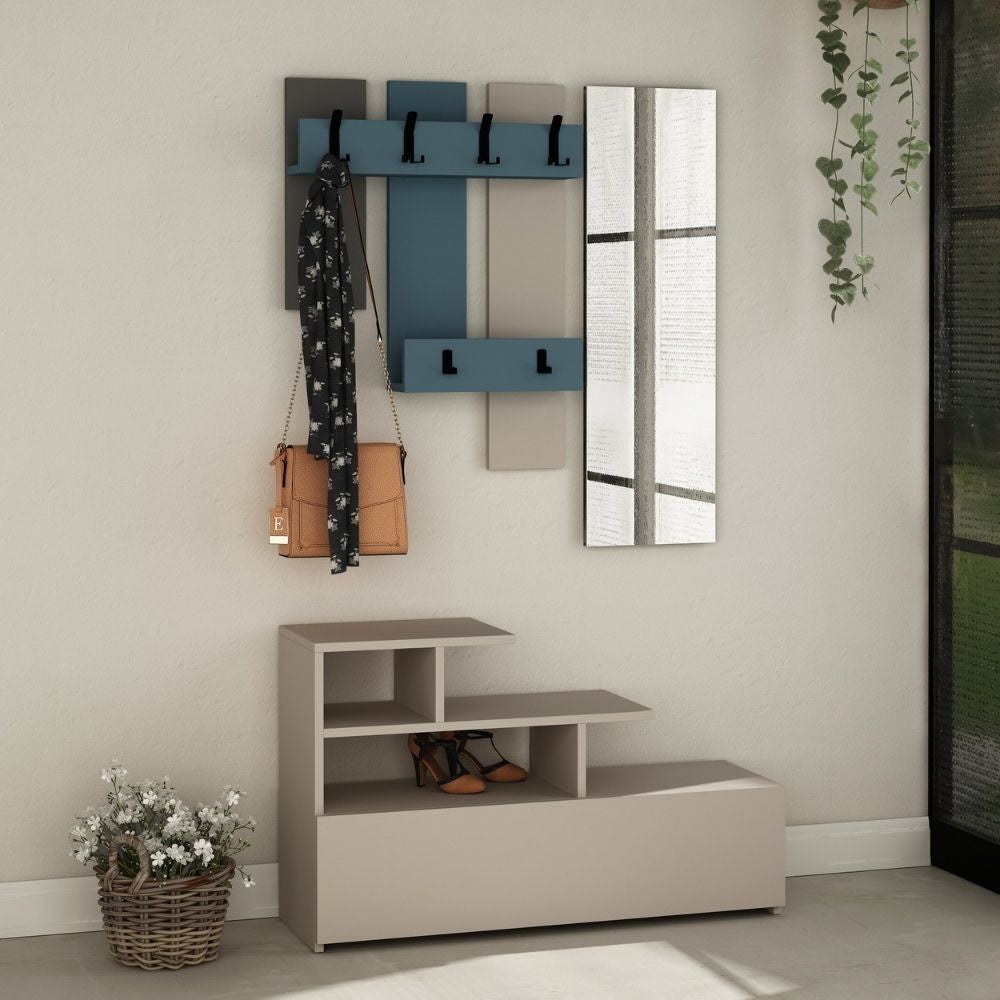 Meuble d'entrée Vesty gris tourterelle turquoise avec étagère à chaussures et miroir