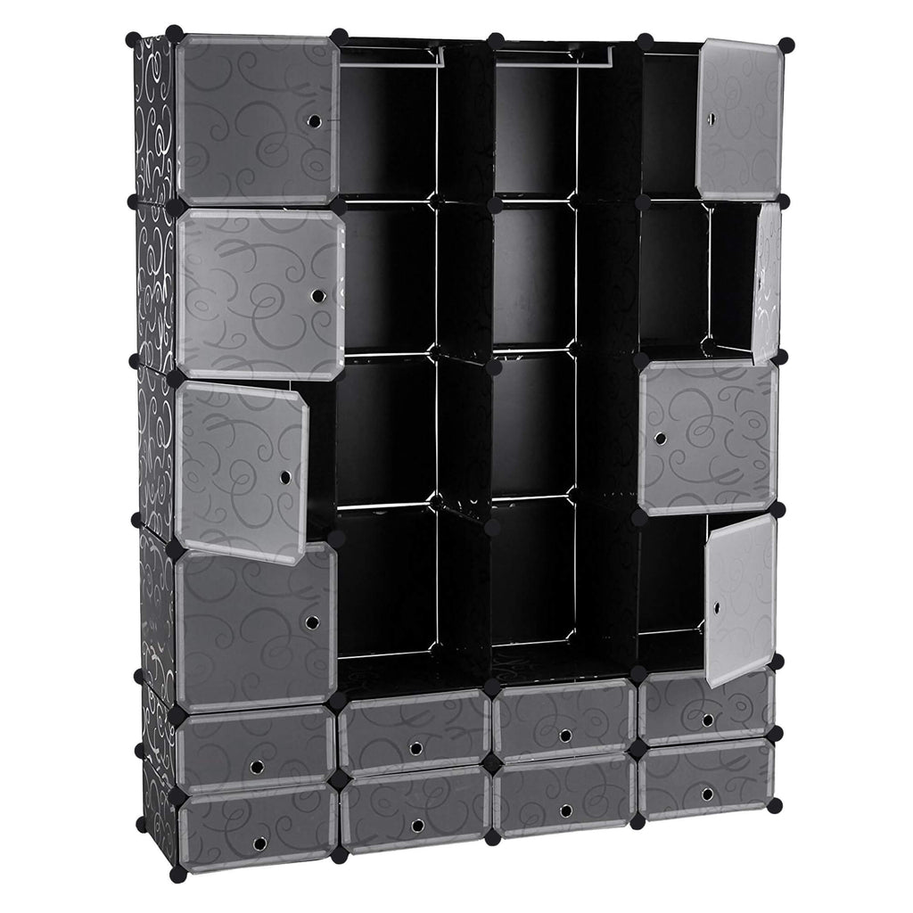 Questo armadio modulare è composto da 8 cubi quadrati con sportello, 8 cubi quadrati senza sportello con aste appendiabiti, e 8 cubi rettangolari in basso per conservare tutte le scarpe, i vestiti o gli accessori in uno spazio ridotto. I cubi possono essere montati insieme o separatamente, offrendo soluzioni personalizzabili per spazi diversi. I cubi possono contenere fino a 2 paia di scarpe mentre i cubi più grandi si adattano perfettamente agli stivali. L'armadio modulare può essere utilizzato per conservare non solo scarpe, ma anche vestiti, accessori, biancheria, CD e DVD, giocattoli e molto altro. I connettori sono realizzati in Zrobusto ABS per unire saldamente i pannelli. L'unità è impermeabilizzata ed è inoltre resistente alla polvere. I pannelli sono facili da pulire con un panno umido. Le porte sono dotate di fori per una facile apertura e flusso d'aria. La caratteristica migliore del prodotto è che può essere assemblato in diverse forme , adattandosi alle proprie esigenze.