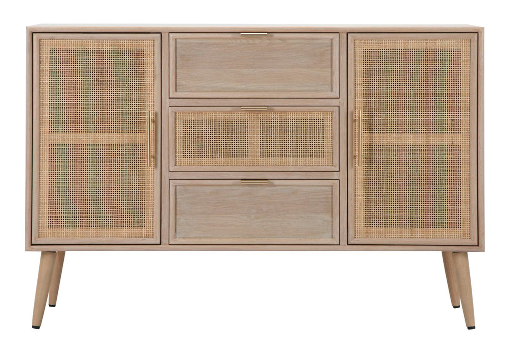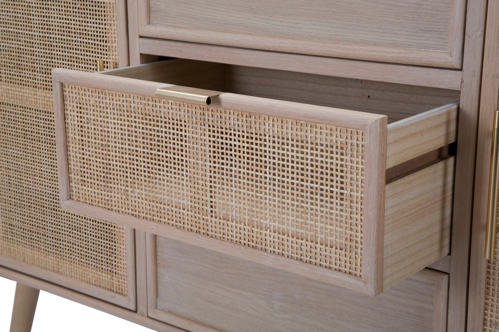 Meuble en bois et paille de Vienne à 2 portes et 3 tiroirs. Le classique se mêle au style glam pour créer un effet unique.