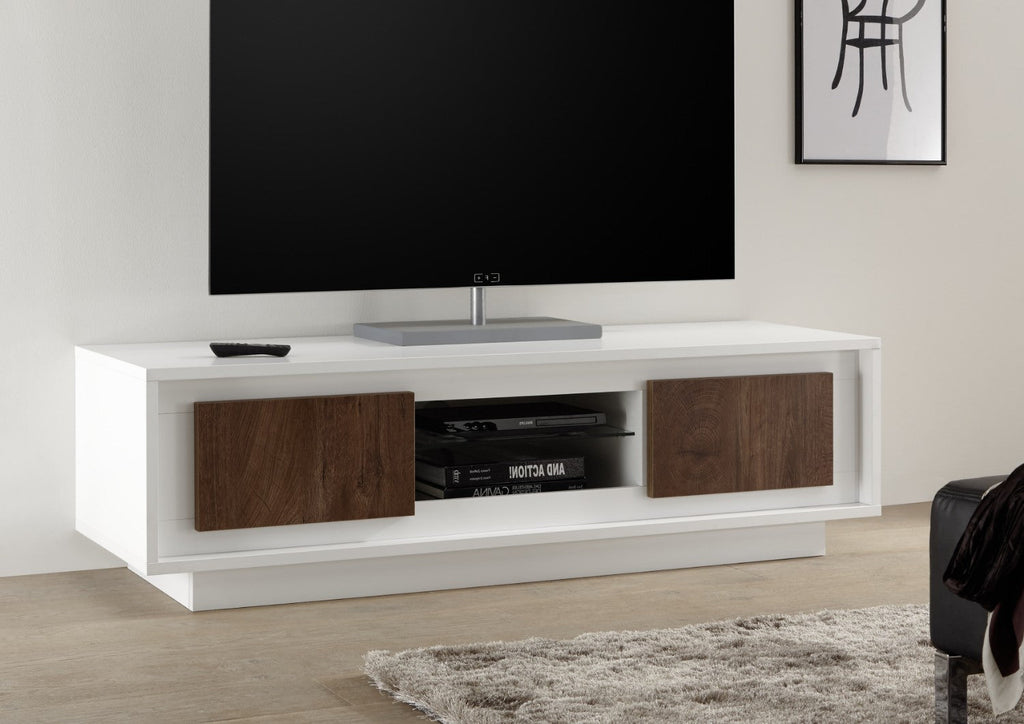Meuble TV 2 portes 156x50x45 cm en cadre bois TFT blanc et chêne