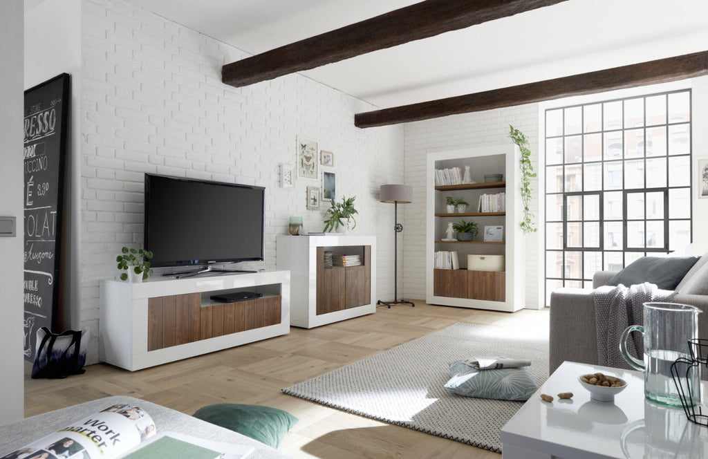 Meuble TV 3 portes 138x42x56 cm en bois TFT Lipari, blanc et noyer