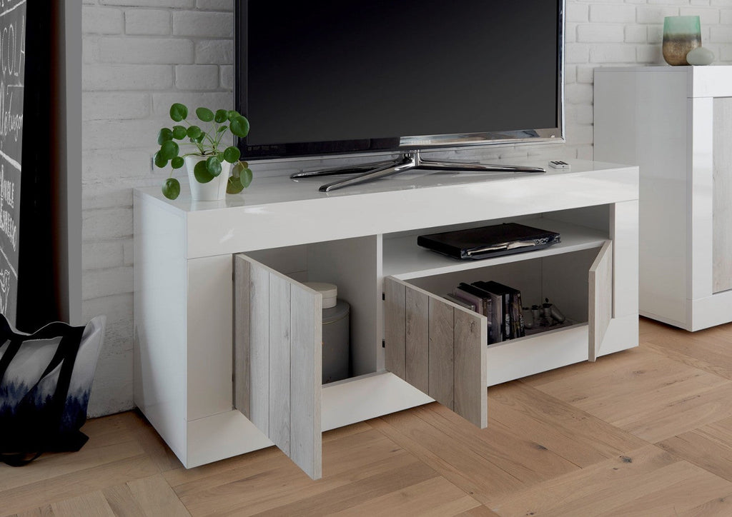 Meuble TV 3 Portes 138x42x56 cm en Bois TFT Blanc Lipari et Pin