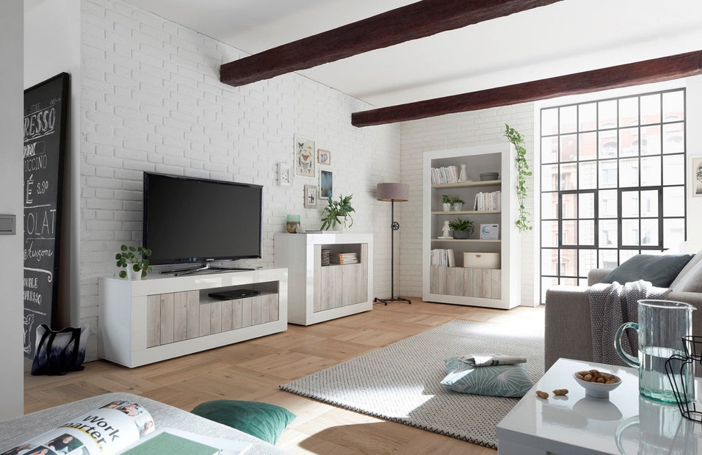 Meuble TV 3 portes 138x42x56 cm en TFT Lipari blanc et bois de pin