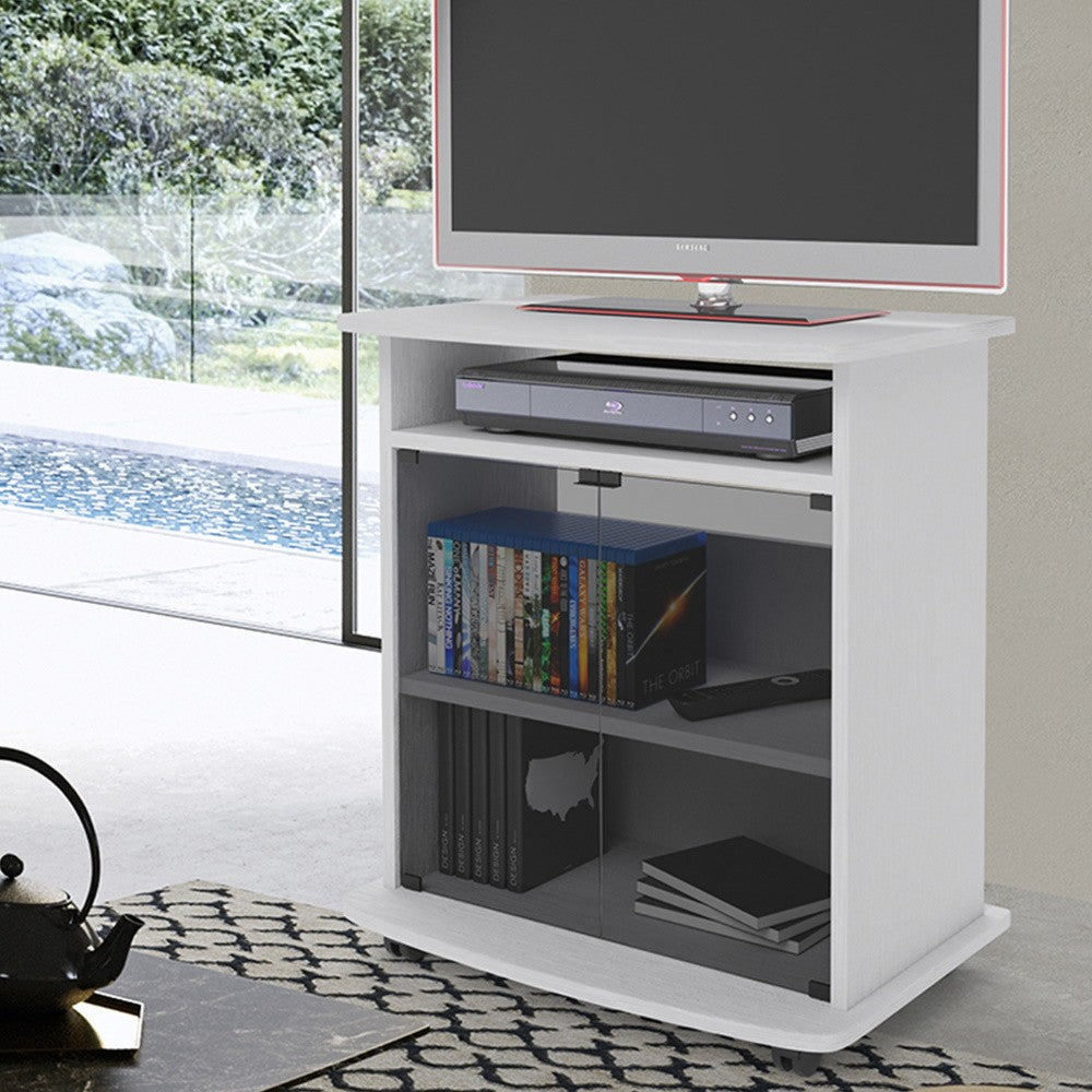 Meuble équipé d'une double porte vitrée foncée, d'une étagère confortable, d'une base de support pour le téléviseur et de 4 roulettes.