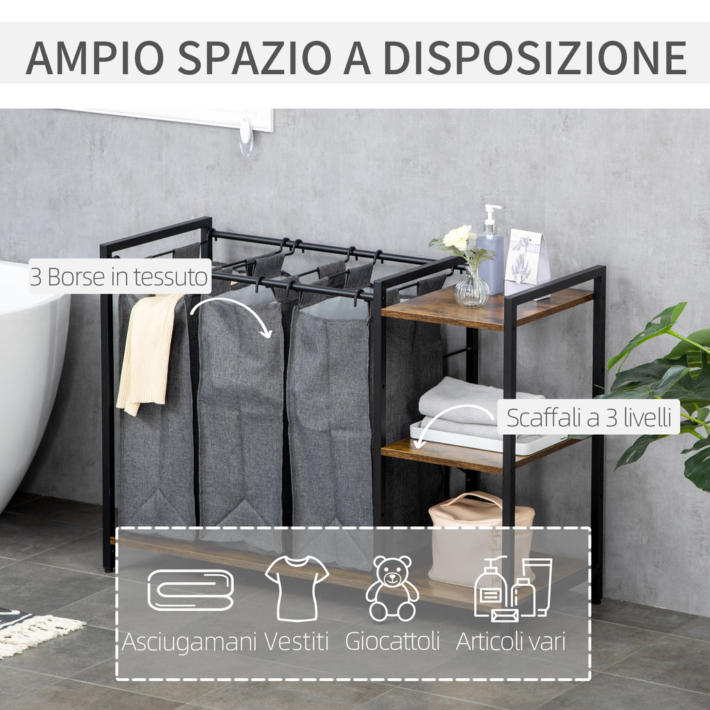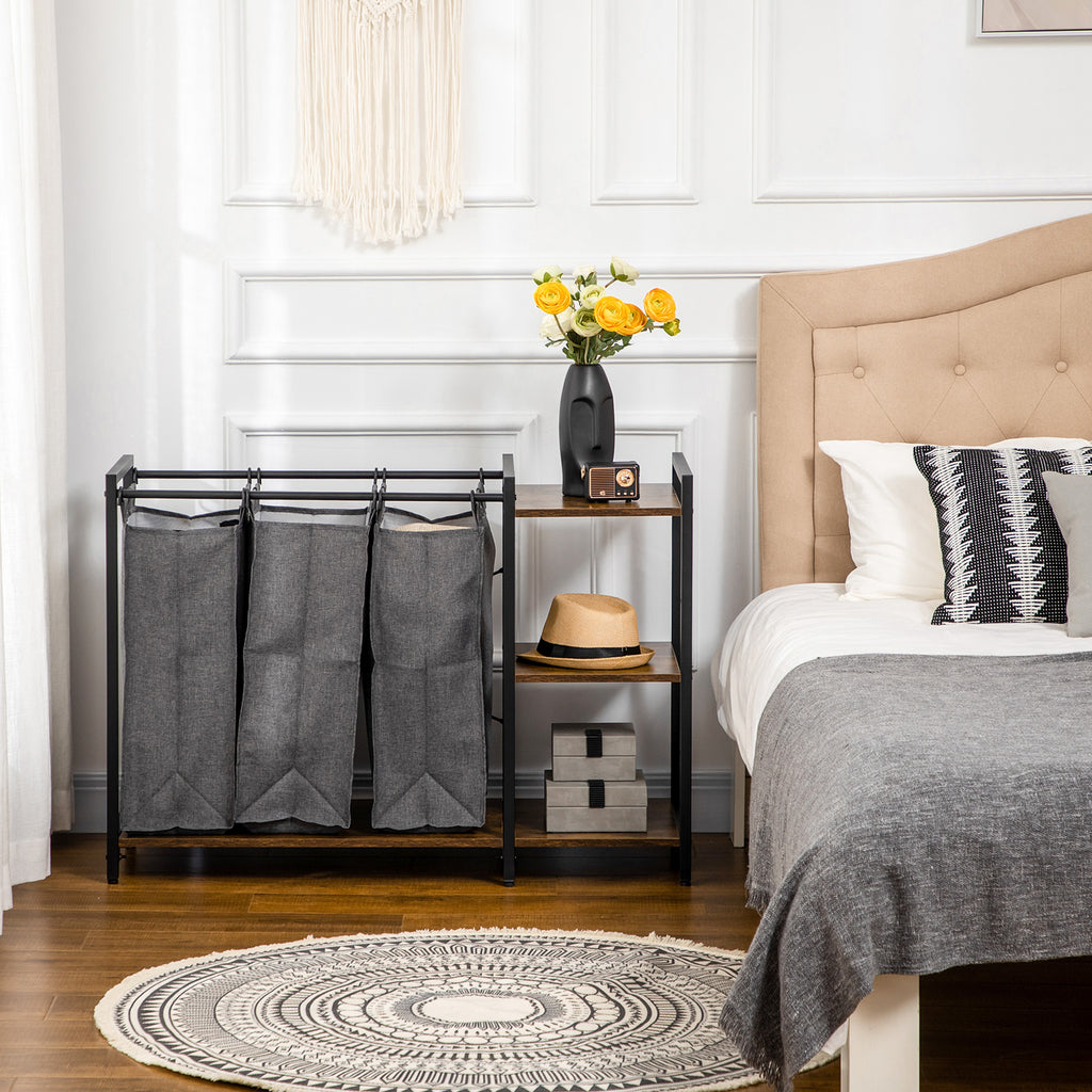 Organisez votre linge de la meilleure façon possible avec l'armoire à linge. Il dispose de 3 sacs en tissu pratiques pour séparer vos vêtements et faciliter le lavage, et vous pouvez les déplacer sans effort pour les emporter là où vous en avez besoin. L'étagère latérale pratique avec 3 étagères offre de l'espace pour vos essentiels. La structure en acier et bois résiste à un usage quotidien et les pieds réglables permettent de maintenir la stabilité.