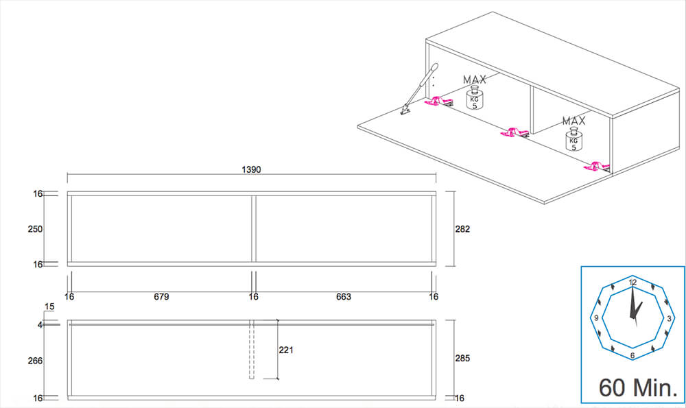 - Dimensions Meuble Rectangulaire Suspendu Horizontal Chêne Wengé : 139x31x29cm X 1