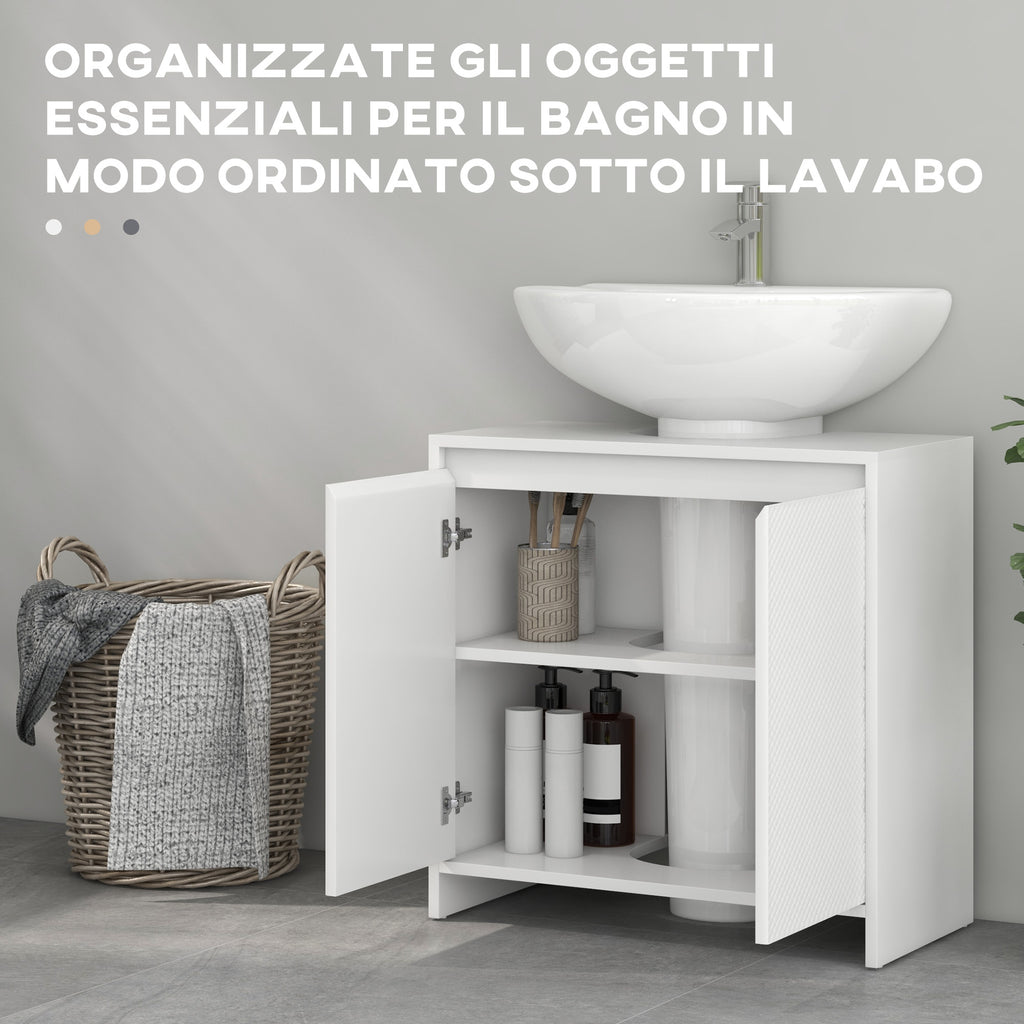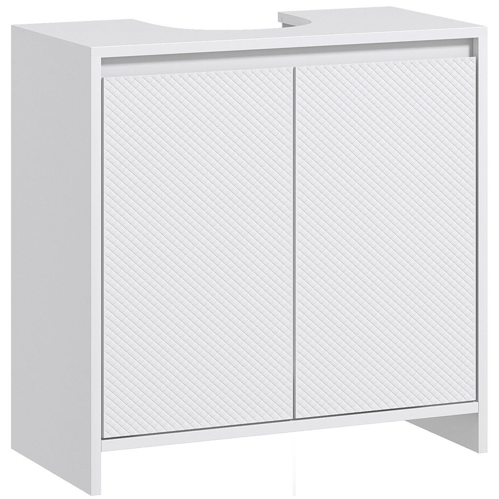 Trasforma il tuo bagno con il mobile sottolavabo. È dotato di due ripiani e progettato con un intaglio a U che lascia spazio ai tubi per posizionarsi completamente sotto al lavabo. Realizzato con ante decorate con un originale motivo a diamante, questo armadietto bagno rinnoverà lo stile della tua casa unendo eleganza e funzionalità.