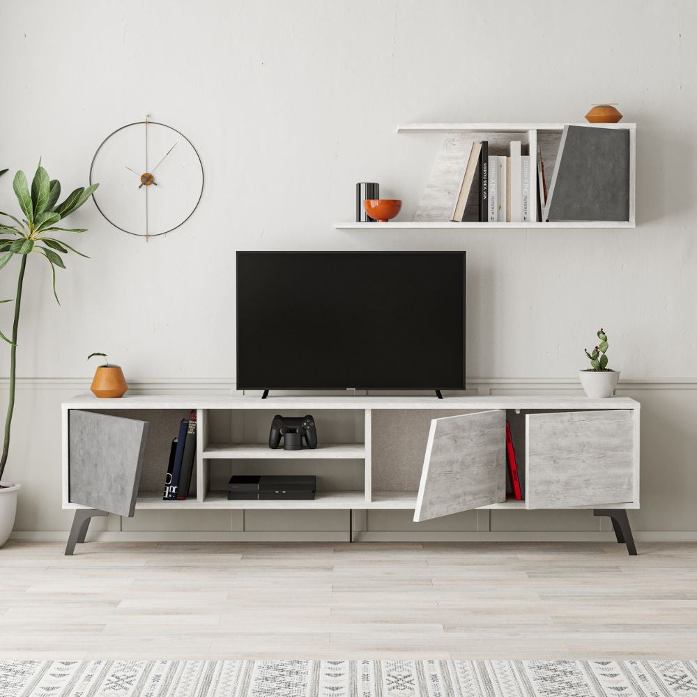 Il porta tv Fiona è un mobile dal colore bianco vintage con un'anta di colore retro grey e piedini neri. È composto da 3 armadietti e 2 vani a giorno a terra, mentre a parete ha 1 armadietto e 1 vano a giorno. È in grado di sostenere una TV fino a 75 pollici ed è realizzato con materiale in truciolare di alta qualità, rivestito con melammina. Ha anche 5 gambe in metallo, altezza 15 cm, e una capacità di peso di 70 kg. Le sue misure sono di H 48 x P 35,60 x L 180 cm.
