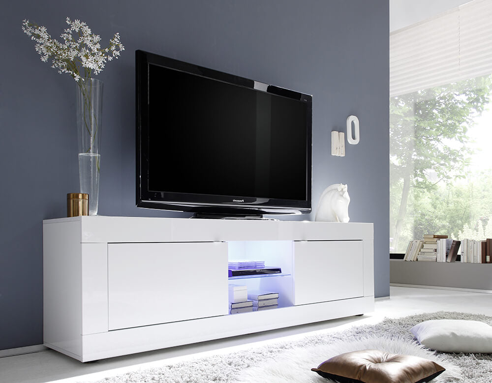 Meuble TV avec 2 portes et 1 niche avec étagère en verre 181x43x56cm TFT Basic Blanc Brillant