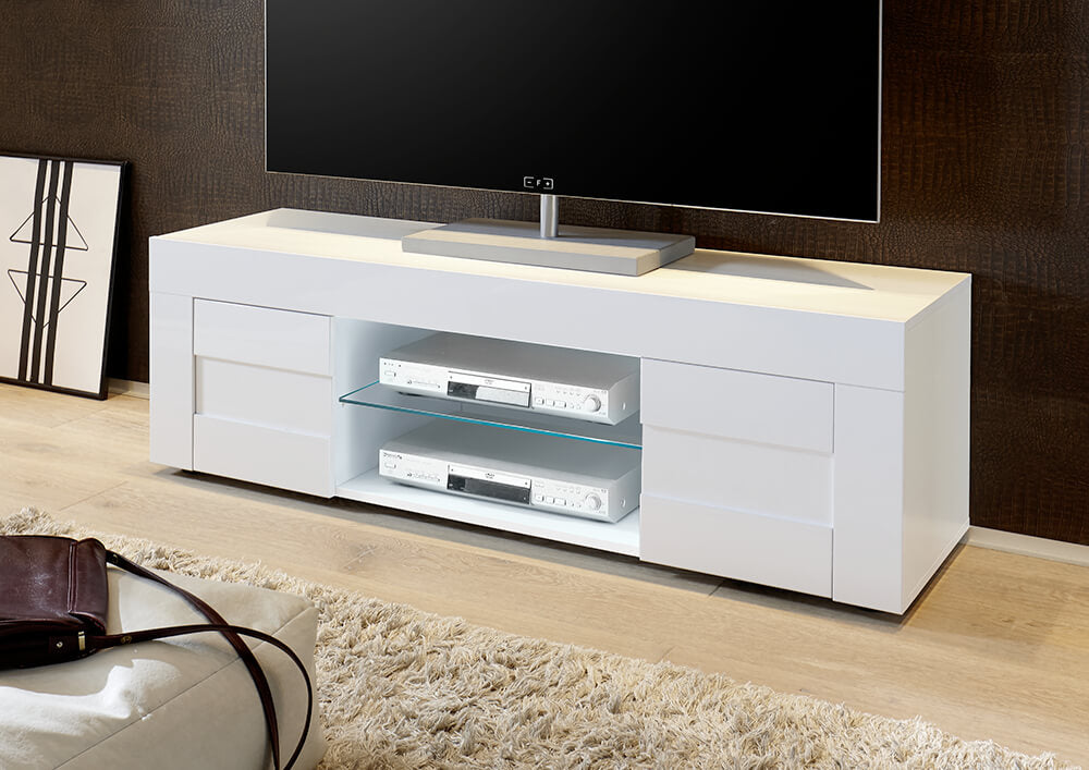 Meuble TV 2 Portes 2 Niches avec Étagère 138x42x44cm TFT Build Blanc Brillant