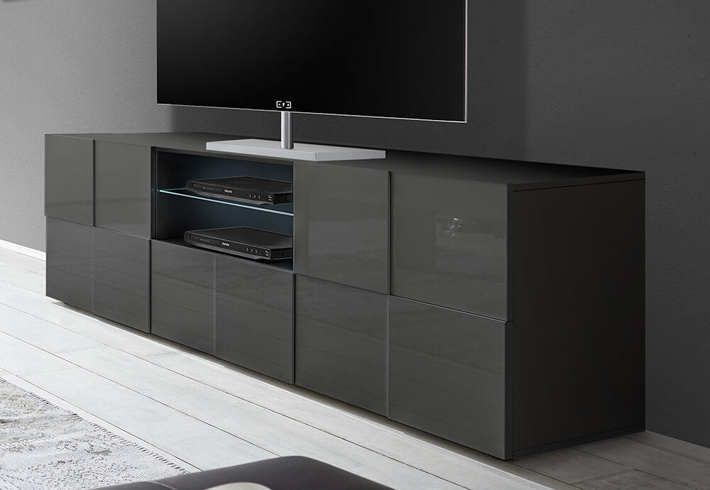 Meuble TV en mélamine avec 2 portes et 2 niches 181x42x57cm TFT Checkers Anthracite Brillant