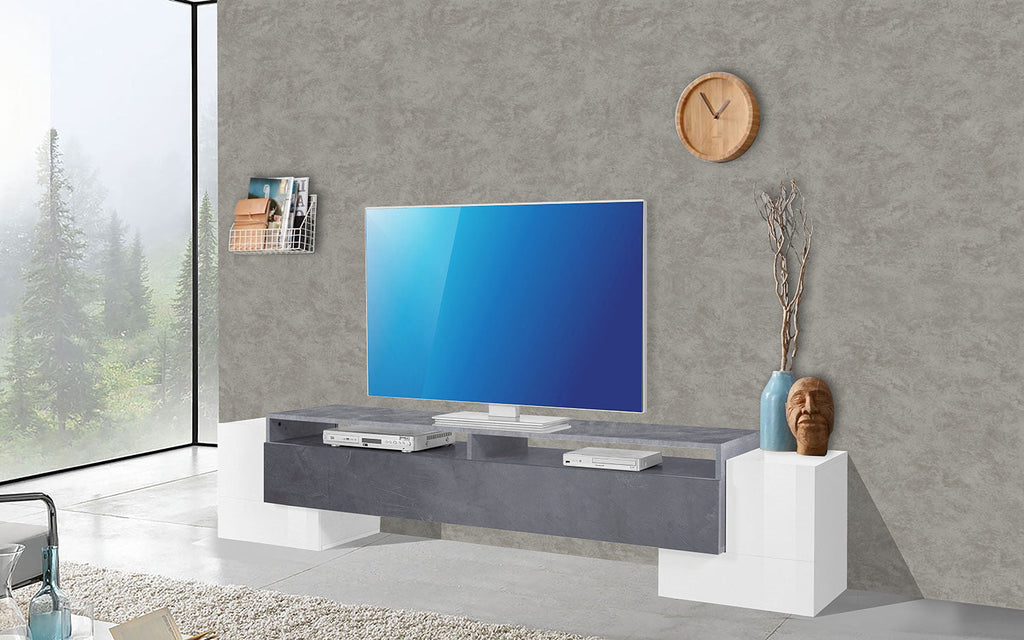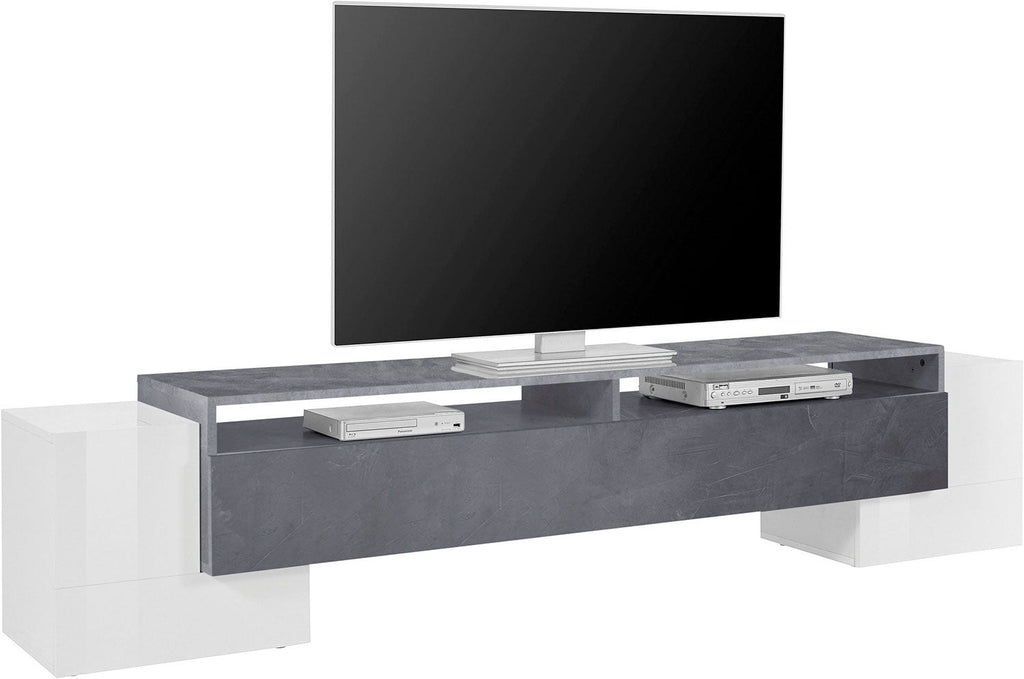 Mobile Tv 3 Ante e Ripiano a Giorno 210x45x45 cm Pillon Low 2A 1R Bianco Lucido/Report Grigio