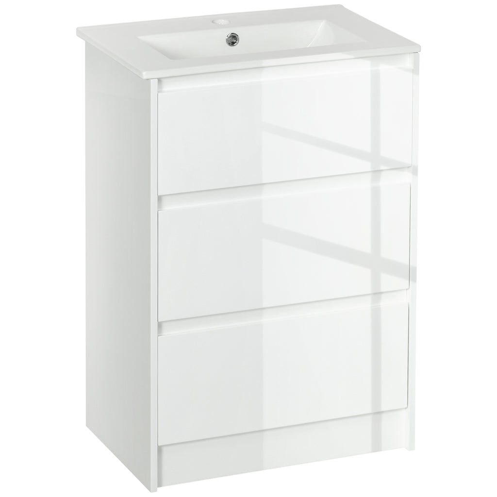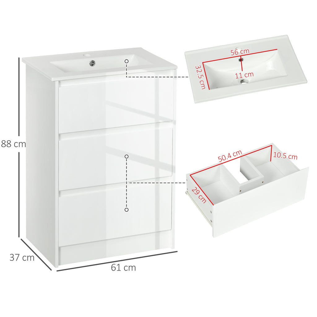 Questo set da bagno comprende un mobiletto bagno con un lavabo che sarà l'aggiunta definitiva e ideale a qualsiasi bagno moderno! Il lavabo è realizzato in ceramica sintetica, rendendosi resistente e facile da pulire. Il mobile bagno con 2 cassetti offre invece un ampio spazio per riporre tutti gli elementi essenziali del bagno, mentre il pannello bianco lucido della superficie aggiunge un tocco di eleganza all'arredamento del bagno.