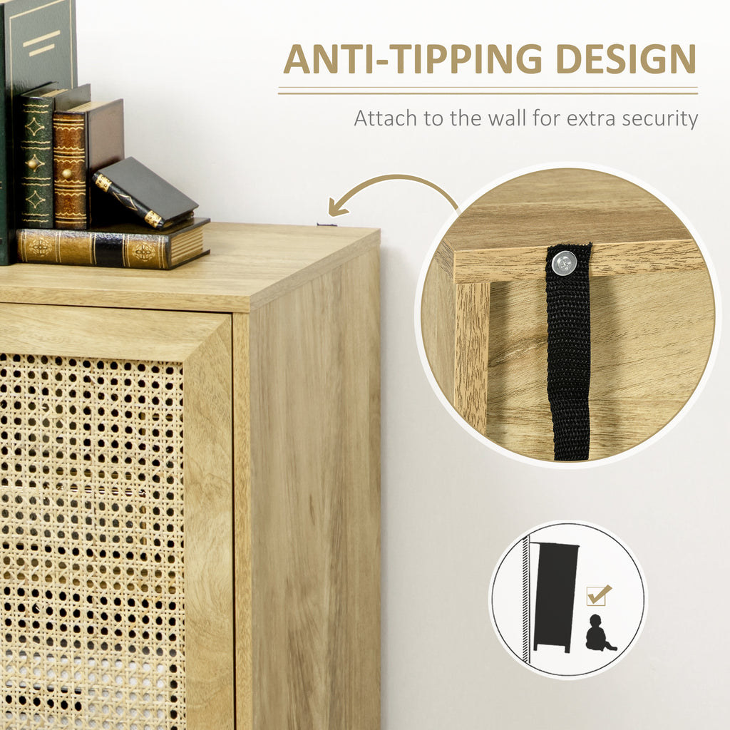 Aggiungi rapidamente lo spazio necessario per tutti i tuoi oggetti con questa credenza . L'elemento in rattan crea un moderno stile boho, aggiungendo un tocco particolare al tuo spazio domestico. Questa credenza moderna offre una soluzione versatile per riporre gli oggetti, grazie a due armadietti e a un ripiano a due livelli. Inoltre, i ripiani regolabili si adattano ad oggetti di diverse altezze. Per mantenere la casa ordinata e pulita, assicurati questo pratico mobiletto basso .