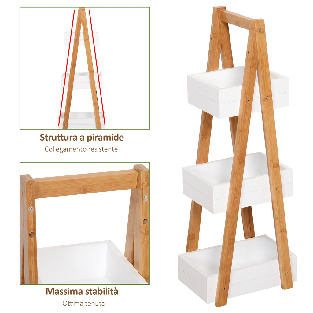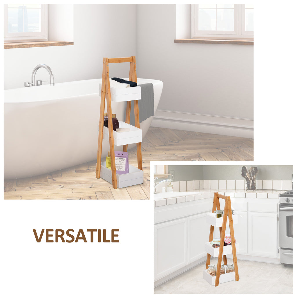 Vous êtes toujours à la recherche d'une solution peu encombrante pour votre meuble de salle de bain ? Alors ne manquez pas cette étagère de salle de bain ! Avec son design compact à 3 étagères, il s'intègre dans n'importe quel espace et grâce à ses lignes minimalistes, vous pouvez également l'utiliser dans la cuisine, la chambre et d'autres pièces de la maison. Fabriqué à partir de panneaux MDF solides et d'un cadre en A en bambou, le meuble de salle de bain est stable et durable. N'attendez plus pour l'amener chez vous !