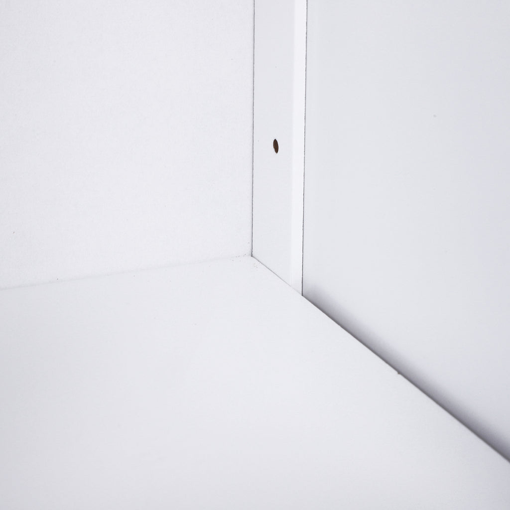 L'armoire est dotée d'une finition blanche avec une armoire à 2 niveaux et une commode à 4 compartiments, parfaite pour garder votre salle de bain propre et organisée.