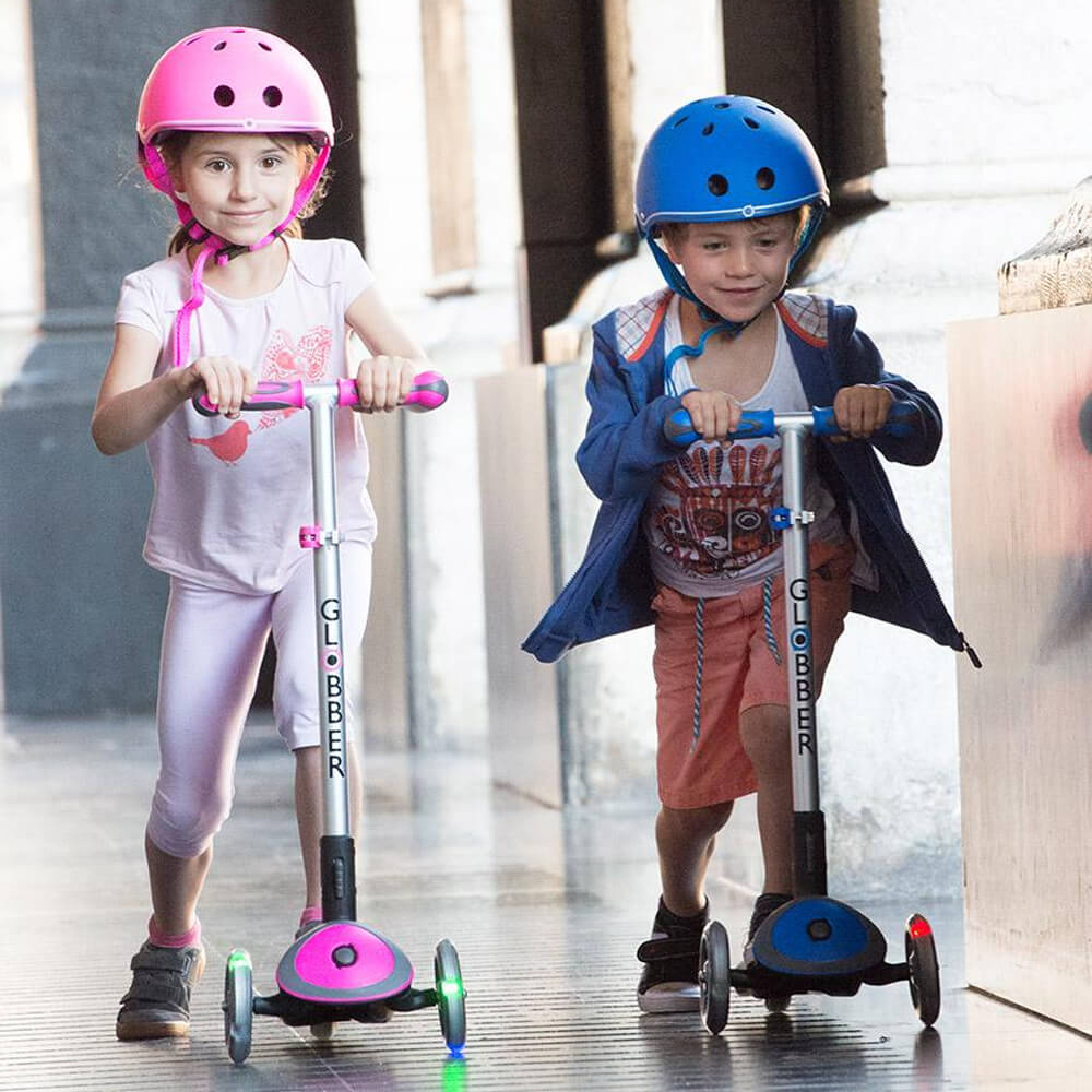 La trottinette LED à 3 roues télescopique et pliable Globber convient à tout enfant à partir de 3 ans d'une taille supérieure à 95 cm et d'un poids maximum de 50 kg.