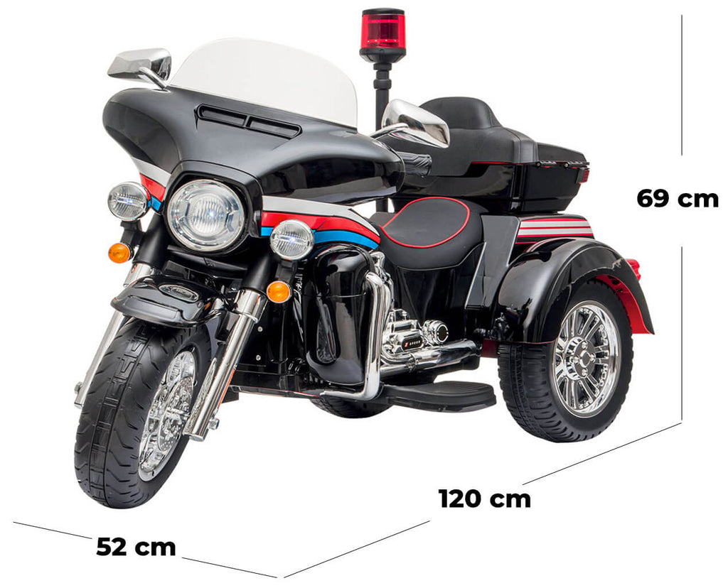 La moto Washington est une reproduction de la moto classique de la police américaine. Sur la selle de cette splendide moto, vos bouts de chou se sentiront comme de vrais motards, grâce au grand coffre arrière et à la sirène clignotante et sonore, ainsi qu'à son design. Le vélo démarre avec une clé de contact de manière très simple et fait voyager vos petits en toute sécurité grâce aux 3 roues. Les commandes fournies servent à activer le rugissement du moteur, le klaxon et les sons.